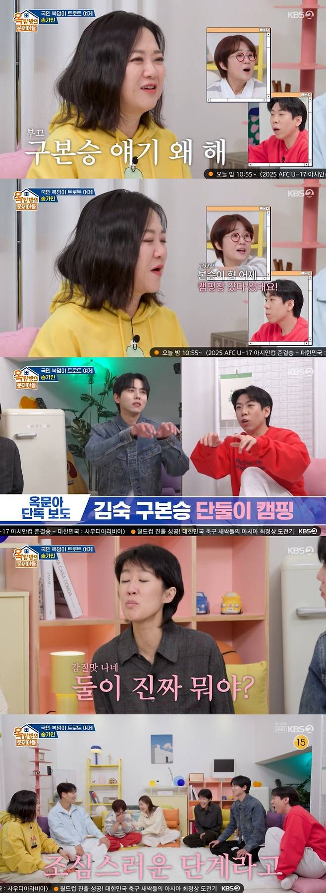 이날 게스트로 나선 송가인은 김숙에게 "아는 배우 오빠랑 캠핑가더라"고 말했고, 송은이는 "어제 구본승과 단둘이 캠핑갔다"고 폭로해 모두를 놀라게 했다.