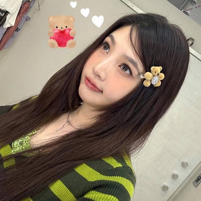 공개된 사진 속 조이는 이모지와 똑 닮은 곰돌이 머리핀으로 귀여운 매력을 자랑하고 있다.