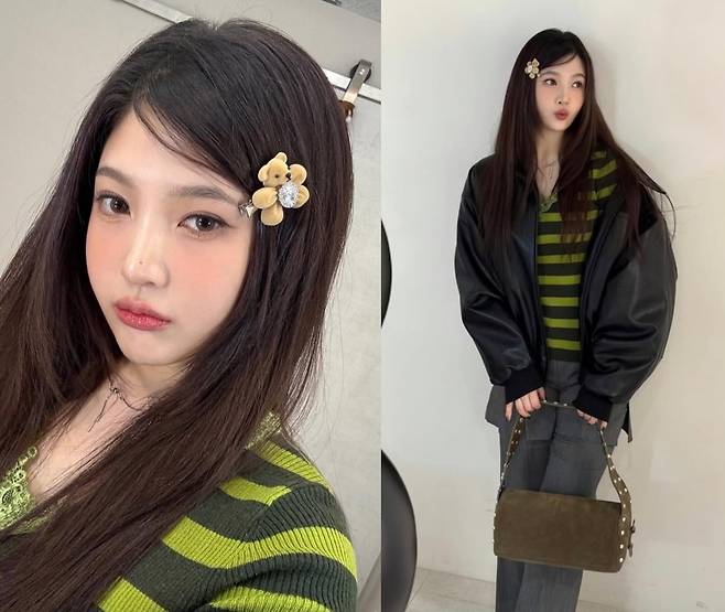 조이는 톤다운된 카키-블랙 스트라이프 니트와 레더 소재의 루즈핏 재킷을 매치해 세련된 '꾸안꾸' 스타일을 완성했다.
