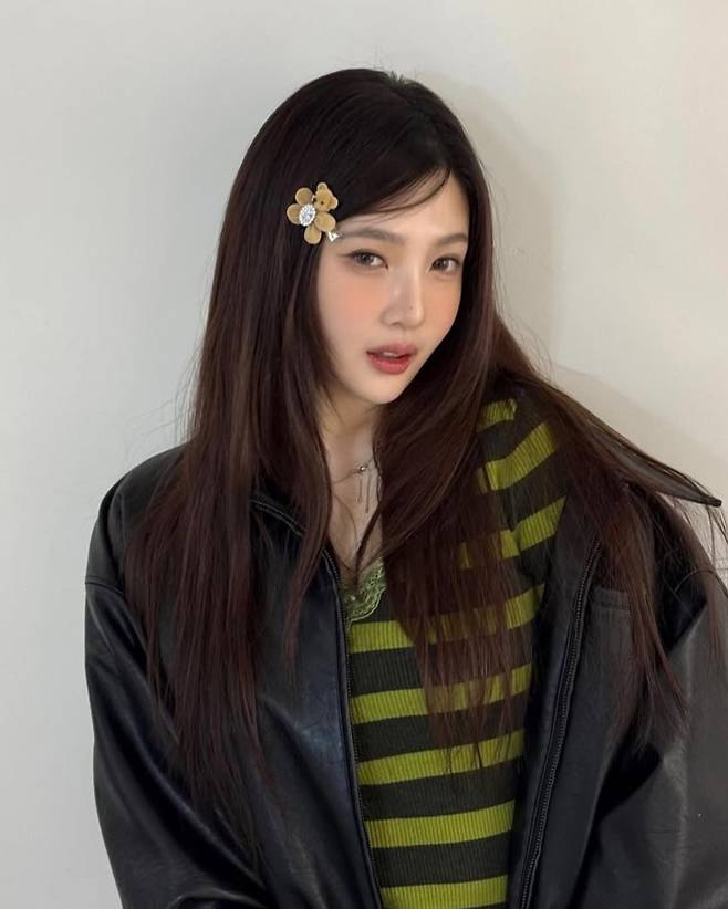 조이는 톤다운된 카키-블랙 스트라이프 니트와 레더 소재의 루즈핏 재킷을 매치해 세련된 '꾸안꾸' 스타일을 완성했다.