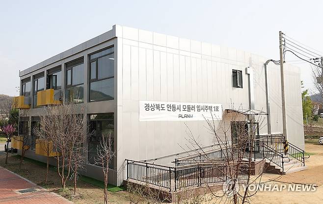 (안동=연합뉴스) 박세진 기자 = 18일 경북 안동시 권정생 어린이문학관 터에 설치된 안동시 1호 임시주택(모듈러주택)의 입주가 시작됐다. 이곳에는 모듈러주택 18동이 설치됐으며 1동당 30㎡로 현관, 욕실, 침실, 발코니로 구성됐다. 사진은 모듈러주택 전경. 2025.4.18