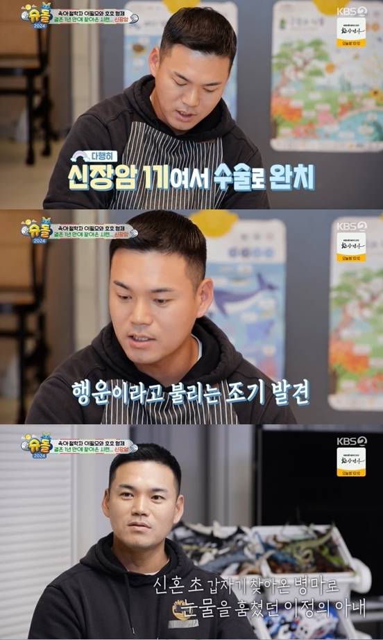 신장암 발병은 결혼 1년 만에 온 비보. 그는 "아내가 진짜 놀랐다"며 "(아내가) 울기도 많이 울었고, 티 안내려고 하는 모습이 더 가슴 아팠다"라고 애틋함을 드러냈다.