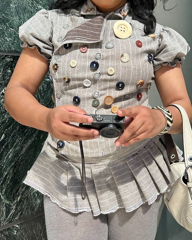 이 비현실적인 이야기는 하나의 SNS 게시물에서 시작됩니다. 그는 자신이 직접 만든 옷의 사진을 올리며, “도이치가 내 옷을 입어주는 게 꿈이야”라는 글을 덧붙였죠. 그의 말처럼, 이 옷은 도이치를 떠올리며 만들어졌습니다. '도이치'하면 떠오르는 대표적인 색인 회색, 크고 작은 단추들이 자유롭게 달린 셋업, 그리고 큼지막한 단추가 장식된 헤어밴드까지. 그의 손끝에서 도이치와 찰떡인 유니크한 무대의상이 탄생했죠.