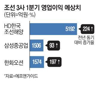조선 3사가 다음주부터 1분기 실적 발표를 앞둔 가운데 영업이익 면에서 '잭팟'이 터질 것이라는 분석이 주를 이룬다.
