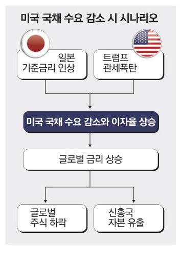 이렇게 미국의 관세 폭탄과 일본의 금리 인상이 결합해 미국 채권 수요가 감소한다면 그다음 단계는 어떻게 되는 것일까. 위 그림에 가능한 시나리오를 정리했다. 결과적으로 미국 국채에 대한 수요 감소는 미국 금리를 상승시킨다. 미국 국채는 글로벌 금융시장에서 기준 자산 역할을 하기 때문에 글로벌 금리도 상승하는데 결국 기업 이윤의 현재 가치인 주식 가격을 하락시킬 수 있다. 과거에 그랬던 것처럼 기술주나 주가수익률이 높았던 주식의 하락이 클 것이다. 더 나아가 높은 금리는 신흥국에 투자됐던 자금을 급속히 미국으로 환원시켜 신흥국의 자본 유출을 일으킬 수도 있다. 금리가 깨어난 일본은 도널드 트럼프 대통령의 관세 폭탄과 시너지를 일으키며 글로벌 금융시장의 지도를 바꾸고 있는 중이다.