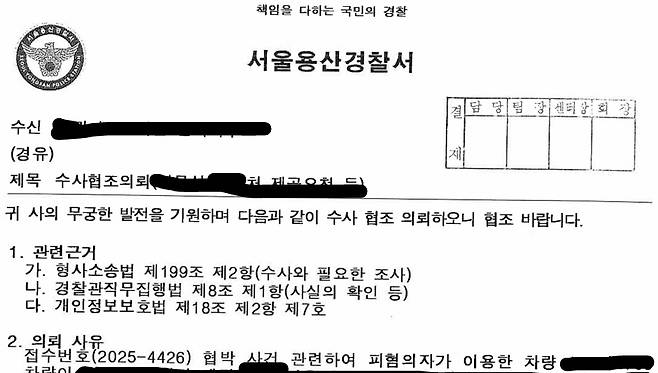 | ▲ 김병주 MBK 회장 측이 홈플러스 물품구매 전단채피해자 비대위를 협박 혐의로 신고해 비대위 측이 받은 수사협조 의뢰 공문 |
