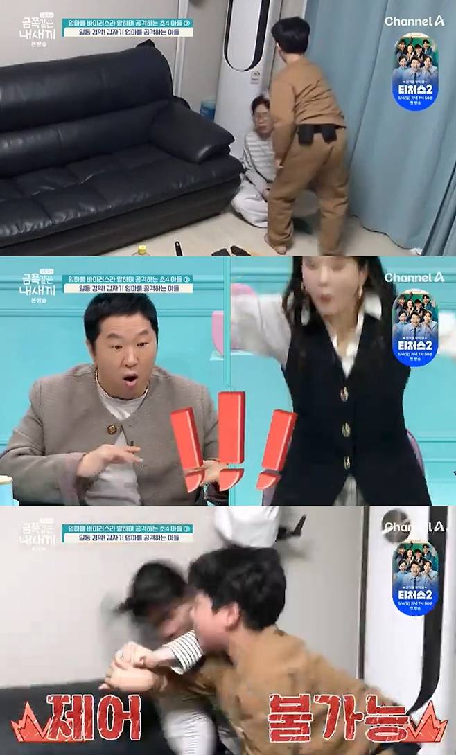 이어 금쪽이의 무차별적인 엄마 폭행 장면이 공개됐다. 금쪽이는 "가라고"라며 엄마를 가격했고, 출연자 보호를 위해 영상 일부가 비공개됐다. 장영란, 정형돈 등 출연진의 경악이 이어졌다. 금쪽이는 "엄마 나가라고 해라", "내가 왜 잘못됐나. 안 맞으려면 엄마가 나가야지"라는 충격 발언을 이어갔다.