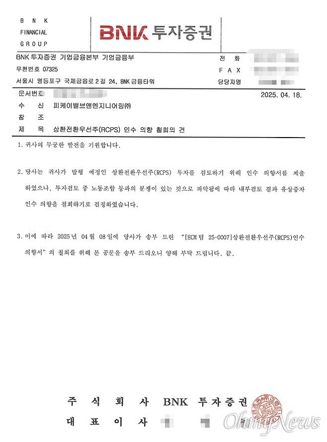 | ▲ BNK투자증권이 피케이밸브앤엔지니어링(PK밸브)에 보낸 상환전환우선주 인수 의향 철회 공문 |