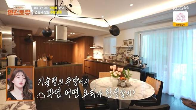 다이닝 룸 옆에는 편집숍을 연상시키는 드레스룸이 공개돼 감탄을 자아냈다. 기은세의 주방 역시 시선을 강탈했다. 백화점 식품관 수준의 온갖 식재료부터, 요리 도구, 수십개의 식기들까지 없는 게 없는 맥시멀리스트의 주방을 자랑했다.
