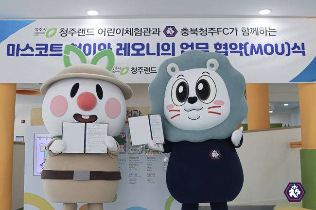 이번 협약식은 기관 관계자들이 참석한 가운데 진행됐으며, 충북청주FC 마스코트 ‘레오니’와 청주랜드 어린이체험관 마스코트 ‘청이’가 함께 협약 퍼포먼스를 선보이며 협력의 상징성을 높였다.