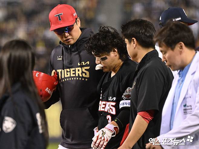 (엑스포츠뉴스 잠실, 김근한 기자) 2025시즌 KIA 타이거즈에 마가 껴도 너무 꼈다. 다음 날 비 예보를 고려해 1군 복귀날 선발 라인업에 이름을 올린 KIA 내야수 김선빈이 1루 베이스 위에서 크게 충돌해 입술 부상을 당한 까닭이다. 오매불망 기다렸던 김선빈의 남은 주말 시리즈 출전 여부도 미궁으로 빠졌다.