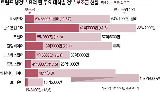 대학별로 차이가 있지만 연간 운영수익에서 정부 보조금이 차지하는 비율은 대개 15% 안팎인 것으로 알려져 있다. 일부 대학은 이 비율이 절반에 육박하기도 한다. 대학들이 트럼프 행정부의 보조금 삭감에 민감한 이유다. 트럼프 행정부가 보조금을 삭감했거나 관련 계획을 갖고 있는 미국 주요 8개 대학의 재무보고서에 따르면 존스홉킨스대의 경우 연간 운영수익(88억7000만 달러)에서 정부 보조금(42억3000만 달러)이 47.6%를 차지한다. 미국 최고의 의학연구센터를 두고 있어 미 보건부 산하 국립보건원(NIH)으로부터 거액의 지원을 받고 있는 데 따른 것. 뉴욕타임스(NYT)는 존스홉킨스대가 “연방 지원금 삭감으로 가장 큰 영향을 받고 있는 기관”이라고 전했다.