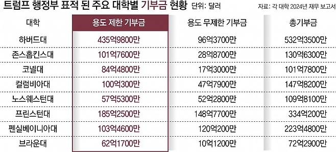 예컨대 하버드대는 기부금의 약 82%(435억9800만 달러)가 용도가 제한돼 있다. 브라운대(86%), 코넬대(83%) 역시 용도가 제한된 기부금 비율이 전체의 80%를 넘는다. 아이비리그 대학들의 용도 제한 기부금 비율은 평균 약 69%다.