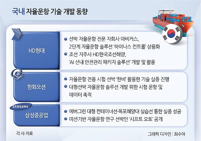 국내 주요 기업의 기술 개발 현황을 보면, HD현대는 다양한 계열사를 통해 자율운항 선박 기술 확보에 속도를 내고 있다. 2018년 HD현대 내 자율운항 연구실로 출발한 자회사 아비커스는 AI 기반의 비전 인지와 센서 융합 기술을 바탕으로 선박 조종제어, 충돌회피, 최적 경로 계획 기술을 발전시켜 왔다. 2020년 4월엔 대형 상선에 탑재하는 항해 보조 시스템을 최초 개발했고, 2022년 6월에는 자율운항 기술을 활용한 대형 선박의 대양횡단에 세계 최초로 성공한 바 있다. 이를 기반으로 2단계 자율운항 솔루션 ‘하이나스 컨트롤(HiNAS Control)’을 상용화하며 기술력을 입증했다.