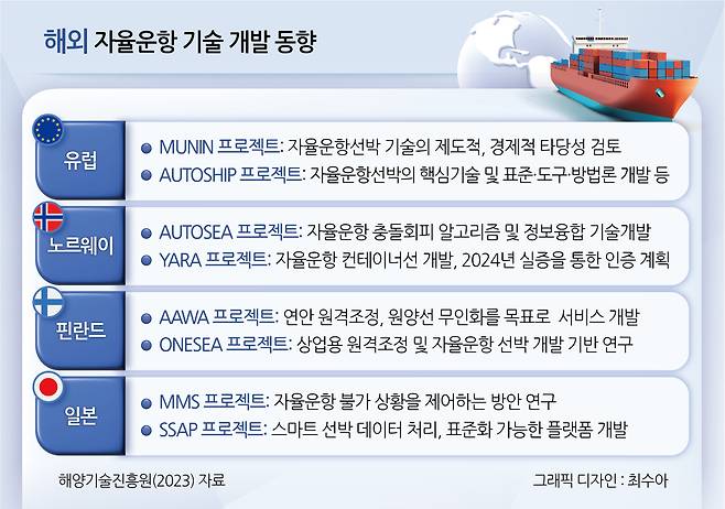 해외에선 대표적으로 유럽연합(EU)이 2012년부터 선박 자율운항을 위한 ‘무닌(MUNIN, Maritime Unmanned Navigation through Intelligence in Networks)’ 프로젝트를 추진해왔고, 일본은 MMS(Mitsui Ship Maneuver Control System) 및 SSAP(Smart Ship Application Platform) 프로젝트를 통해 자율 운항 제어와 표준화를 위한 개방형 플랫폼 구축을 이어왔다.