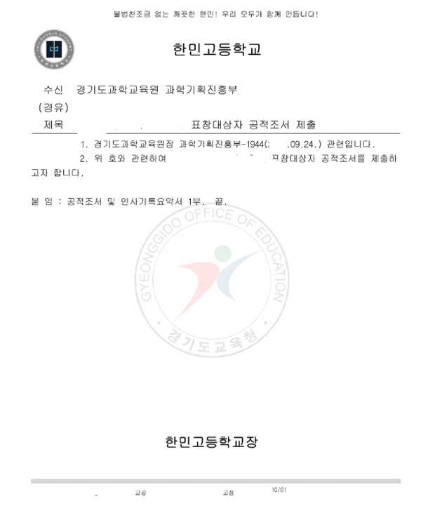 그런데 바로 이날, 당시 한민고 교장은 공문 하나를 결재합니다. 1주일 전 수신했던 경기도과학교육원 공문에 따라 장관 표창 대상자의 공적조서를 제출하는 내용이었습니다.