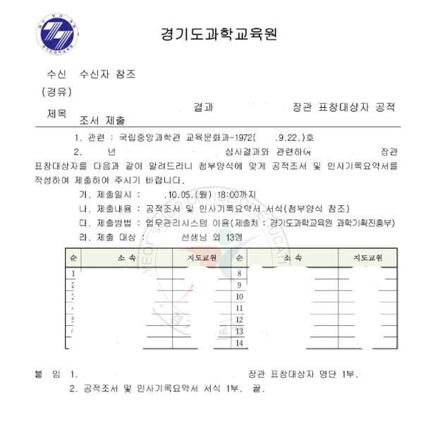 0000년 9월 24일, 경기도과학교육원이 한민고에 공문 한통을 보냅니다. OOO장관 표창 대상자를 통보하며, 수상자의 공적조서와 인사기록요약서를 작성해 제출하라는 내용이었습니다.