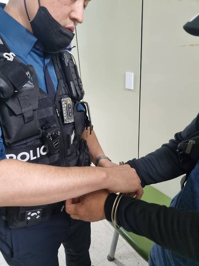 | ▲ 출동한 경찰이 수원지방노동청에서 이주노동자 A씨에게 수갑을 채우고 있다. |