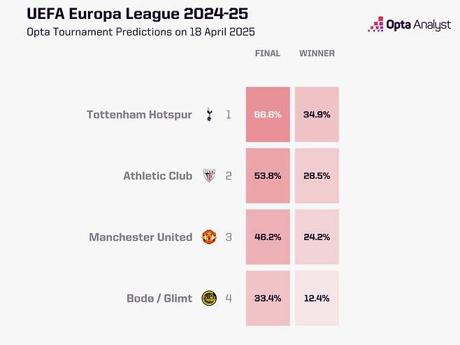 '옵타'는 빌바오의 우승 확률을 28.5%, 맨유의 우승 확률을 24.2%로 분석했다. 결승 진출 가능성은 빌바오(53.8%)가 맨유(46.2%)보다 앞선다. 매체의 분석대로면 토트넘이 결승에 오를 경우 상대는 빌바오가 될 공산이 크다.