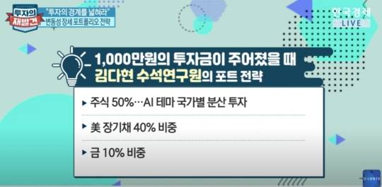 김다현 KB증권 WM투자전략부 수석연구원은 1천만 원의 투자금이 주어졌을 때 주식과 채권, 그리고 금의 비중을 5:4:1 정도로 가져갈 것이라고 말했는데요. 주식은 AI테마 안에서 국가별로 나눠서 투자할 것을 강조했습니다.