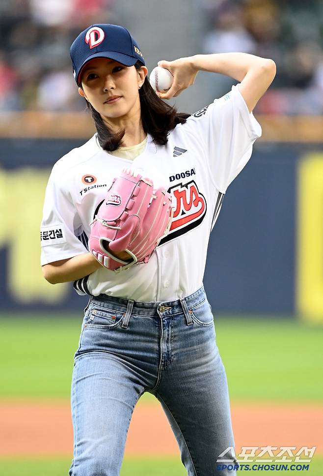 19일 잠실야구장에서 열린 두산과 KIA의 경기, 아나운서 강지영이 시구를 하고 있다. 잠실=허상욱 기자wook@sportschosun.com/2025.04.19/