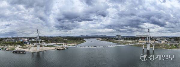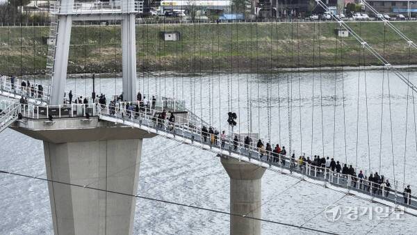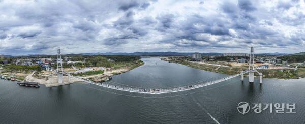 여주 남한강 출렁다리 임시개방이 진행된 19일 오후 출렁다리를 찾은 시민들이 남한강 풍경을 즐기고 있다. 내달 1일 여주도자기 축제 개막일 맞춰 정식 개통하는 남한강 출렁다리는 신륵사관광지와 금은모래관광지구를 잇는 길이 515m, 폭 2.5m의 보도 현수교로 성인 1천2백명이 동시에 통행 가능하다.