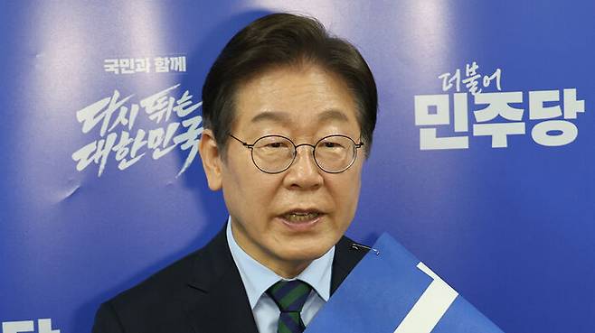 ▲ 19일 오후 충북 청주체육관에서 열린 '제21대 대통령 선거 후보자 선출을 위한 충청권 합동연설회'에서 경선 결과 발표를 들은 뒤 기자들과 질의응답 진행하는 이재명 민주당 대선 경선 후보