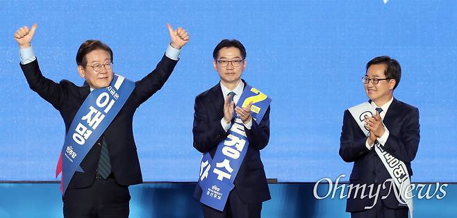 | ▲ 충청서 합동연설 시작한 이재명·김경수·김동연 더불어민주당 대선 경선 주자인 이재명 후보가 19일 충북 청주시 청주체육관에서 열린 제21대 대통령선거 후보자 선출을 위한 충청권 합동연설회에서 엄지손가락을 치켜들고 지지를 호소하고 있다. 오른쪽은 김경수·김동연 후보. |