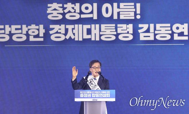 | ▲ 더불어민주당 대선 경선 주자인 김동연 후보가 19일 충북 청주시 청주체육관에서 열린 제21대 대통령선거 후보자 선출을 위한 충청권 합동연설회에서 지지를 호소하고 있다. |