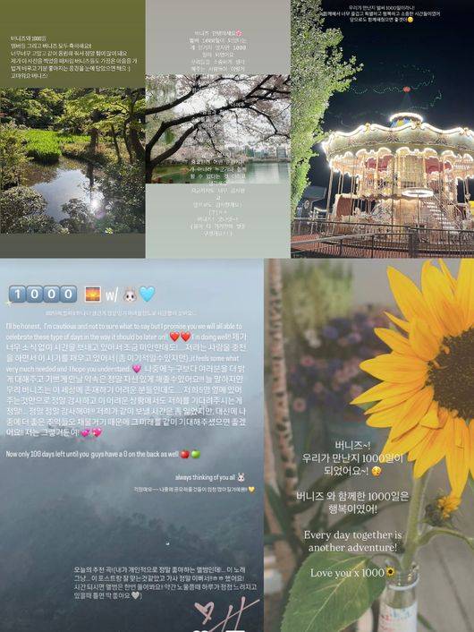 또한 멤버들은 “버니즈와 1000일. 멤버들 그리고 버니즈 모두 축하해요! 너무 고맙고 같이 응원해 줘서 정말 힘이 많이 돼요. 제가 이 사진을 찍었을 때처럼 버니즈들도 가끔은 마음을 가볍게 비우고 기분 좋아지는 풍경을 눈에 담았으면 해요. 고마워요 버니즈”라고 고마움을 표했다.