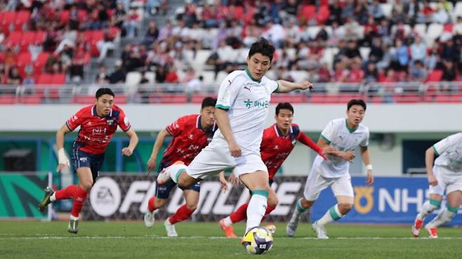 전반을 1대 0으로 앞선 대전은 후반 9분 주민규의 페널티킥 골로 승부를 더 기울였습니다.