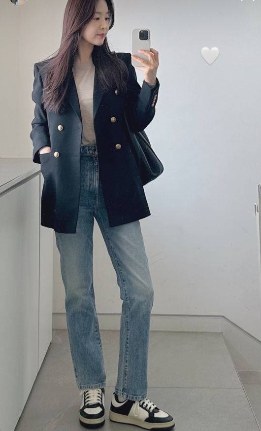 한지혜는 슈퍼모델 출신답게 큰 키에 작은 얼굴 등 뛰어난 비율을 활용한 다채로운 패션을 선보이는 것으로 유명하다. 그는 이날 자연스럽게 늘어뜨린 긴 머리카락에 적당한 핏의 자켓, 그리고 편안한 느낌의 청바지에 운동화를 매치해 봄과 딱 맞는 차분한 컬러감을 갖춘 코디를 뽐냈다.