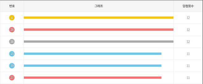 로또 역대 최다 당첨 번호는 로또 추첨 총 횟수 350회 중 12회로 6번 (당첨 확률 3.429%)이다.