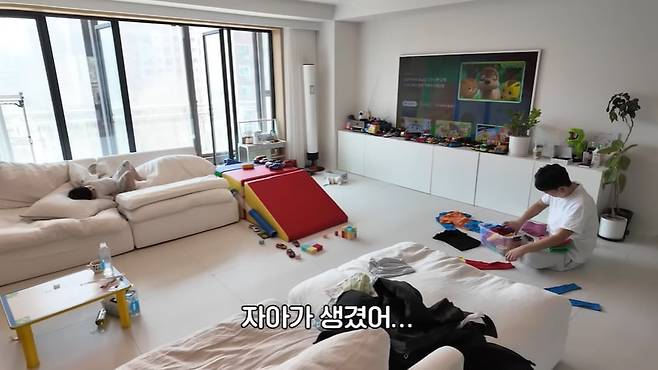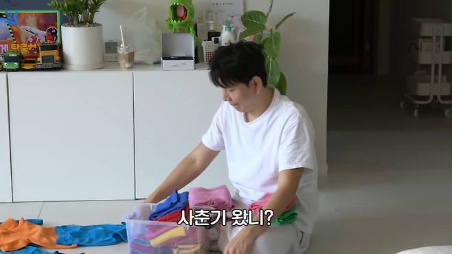 제이쓴은 "아빠가 바지 이만큼 나놨다", "준범이 쿨톤이니까 파란색 입겠냐", "아빠가 젤리 2개 사주겠다" 등 꼬득였다.