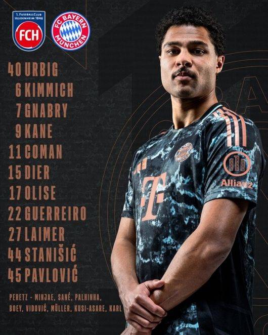 원정팀 뮌헨은 4-2-3-1 전형을 내세웠다. 요나스 우르비히가 골문을 지키고, 하파엘 게헤이루, 요시프 스타니시치, 에릭 다이어, 콘라트 라이머가 백4를 구성한다. 3선에서 알렉산다르 파블로비치와 요수아 키미히가 호흡을 맞추고, 2선에 세르주 그나브리, 마이클 올리세, 킹슬리 코망이 배치, 원톱은 해리 케인이 이름을 올렸다.