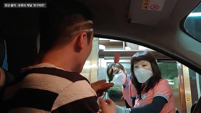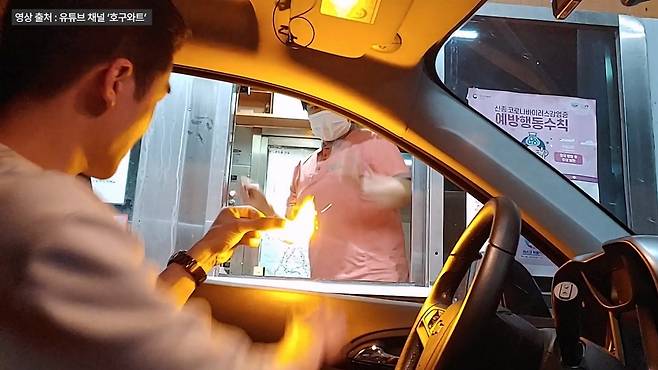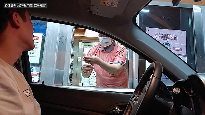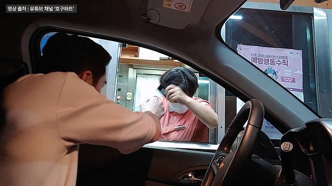 급히 밖으로 나와 영수증을 주워 건네는 직원. 그런데 영수증을 받고도 운전자는 꼼짝하지 않더니 시비를 겁니다.