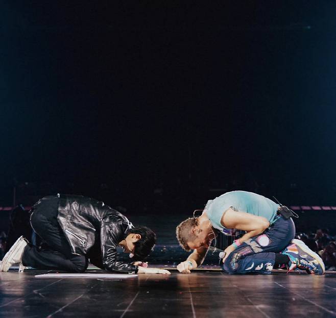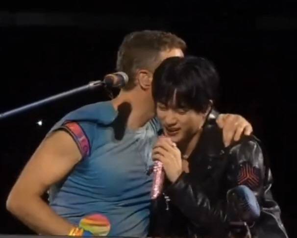 2년 6개월 만에 한국에서 재회한 진과 콜드플레이는 맞절로 인사를 나눴다. 이후 '마이 유니버스'와 '디 애스트로넛'으로 합동 공연을 펼쳤다. 특히 화제를 모았던 건 진을 대하는 크리스 마틴의 태도였다. 마틴은 꿀 떨어지는 눈빛으로 진을 바라봤고, 노래를 부른 뒤 진에게 어깨동무를 하며 키스를 퍼부었다.