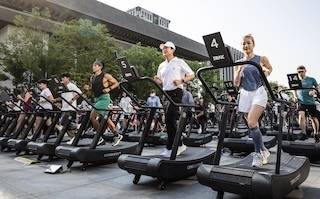 [세훈 서울시장이 18일 오후 광화문광장에서 열린 '손목닥터9988' 100만명 돌파 기념행사에서 무동력 트레드밀 걷기 챌린지에 참여하고 있다. (사진=연합뉴스)]