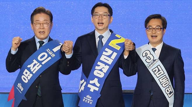 ▲ 더불어민주당 대선 경선 후보들이 19일 오후 충북 청주체육관에서 열린 '제21대 대통령선거 후보자 선출을 위한 충청권 합동연설회'에 참석해 있다. 왼쪽부터 이재명, 김경수, 김동연 후보.