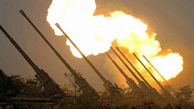 ▲ 노동신문이 2020년 3월 10일 공개한 훈련 사진. 170㎜ 자주포로 추정되는 무기가 여러 발 발사되는 모습.