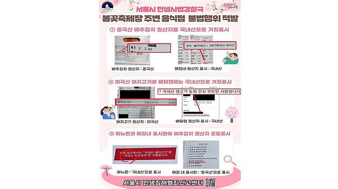 서울시 민생사법경찰국(민사국)은 서울 시내 봄꽃 축제장 주변 음식점을 대상으로 원산지 표시 특별단속을 벌여 12개소를 적발했다고 밝혔습니다.