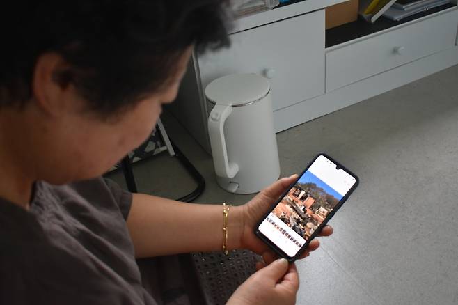 | ▲ 2022년 3월 5일 발생한 대형산불로 주택이 전소된 강원도 동해시 괴란동의 70대 주민. 휴대폰으로 찍은 전소된 집을 들여다보고 있다. 그 주민은 시부모님이 지은 집을 잃고 임시 조립주택으로 들어갔다. 고령층 이재민들은 복구 비용을 감당하지 못해 집을 다시 짓지 못하는 사례도 많다. |