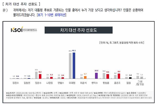 질문을 선호도가 아닌 '당선 가능성'으로 물었을 경우에는 이재명 예비후보가 과반 이상을 얻었다. 이재명(53.1%), 한덕수(12.1%), 홍준표(7.7%), 김문수(6.7%), 한동훈(6.5%), 이준석(3.2%), 나경원(2.8%), 안철수(2.1%), 김동연(0.9%), 김경수(0.2%) 등 순으로 나타났다.