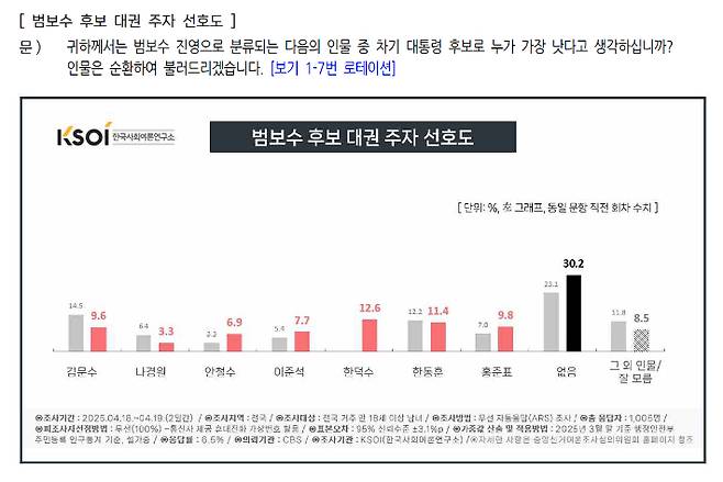국민의힘 경선과는 별개로 '범보수 진영'에서의 대선 주자 선호도 조사에서는 한덕수 대행이 12.6%로 1위였고, 그 뒤를 한동훈(11.4%), 홍준표(9.8%), 김문수(9.6%), 이준석(7.7%), 안철수(6.9%), 나경원(3.3%) 등이 이었다. '없음'은 30.2%, '그 외 또는 잘 모름'은 8.5%였다.