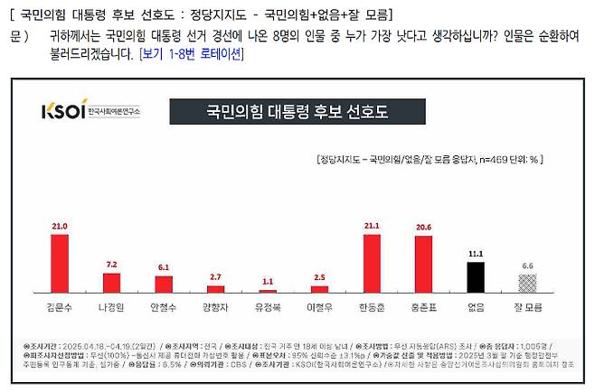 국민의힘 예비후보 중 선호도 조사에서는 홍준표(13.9%), 한동훈(13.6%), 김문수(13.5%), 안철수(9.1%), 나경원(4.8%), 양향자(2.2%), 이철우(2.0%), 유정복(1.4%) 순이었다. '없음'은 32.9%, '잘 모름'은 6.5%에 달했다.
