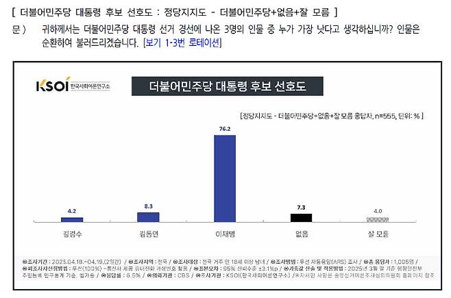 다만 지지하는 정당을 '민주당' 또는 '무당층(없음+잘 모름)'으로 응답한 이들로 분석해보면 이재명 예비후보가 76.2%로 압도적으로 나타났다. 김동연(8.3%), 김경수(4.2%) 순이었고, '없음'은 7.3%, '잘 모름'은 4.0%로 각각 집계됐다.