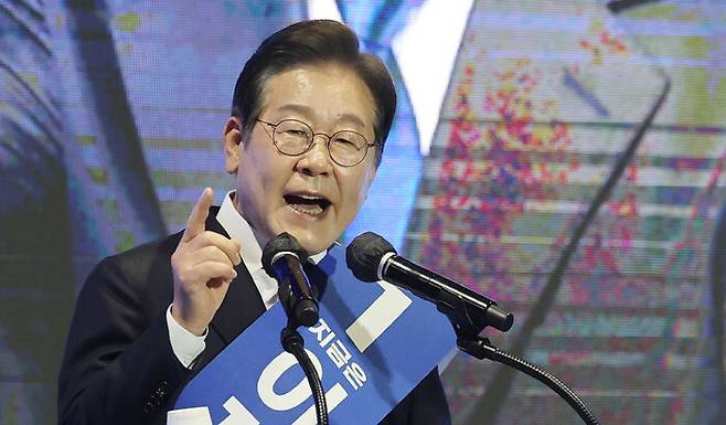▲ 이재명 더불어민주당 대선 경선 후보가 20일 '제21대 대통령선거 후보자 선출을 위한 영남권 합동연설회'에서 정견 발표를 하고 있다.