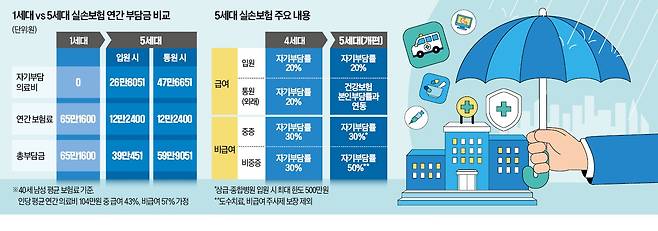 5세대 실손보험은 암, 뇌혈관·심장질환 등 중증 비급여에 대해선 4세대와 동일한 보상 한도(연 5000만원), 자기부담률(30%)을 유지한다.