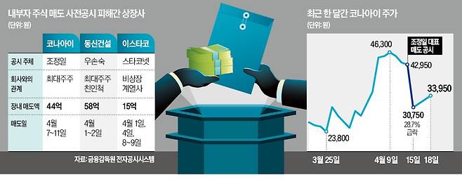 내부인의 주식 매도 소식이 알려지자 관련 기업 주가는 줄줄이 곤두박질쳤다. 코나아이는 15일 하루 동안 28% 급락했다. 조 대표의 주식 처분 소식이 전해진 직후다. 동신건설과 이스타코 주가도 내부자 매도 후 18일까지 각각 16.1%, 14.5% 밀렸다.