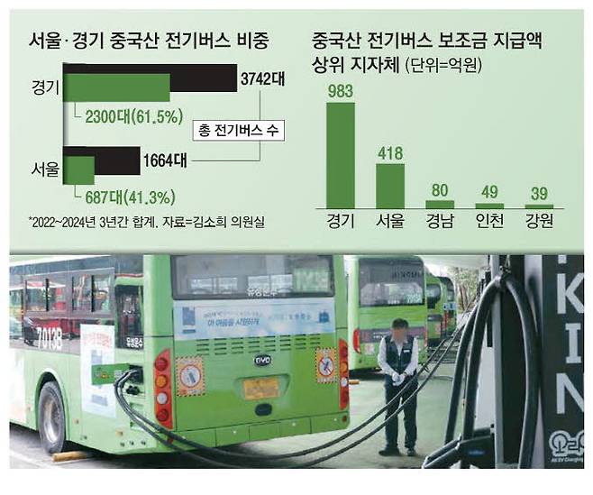 중국산 전기버스 보급 대수를 살펴보면 경기도가 압도적으로 1위였다. 경기도는 2022년부터 2024년까지 도입한 전기버스 총 3742대 가운데 중국산이 2300대에 달했다. 이는 같은 기간 전국에 보급된 중국산 전기버스의 61.5%에 달하는 숫자다. 이어 서울(687대), 경상남도(172대), 인천(167대) 등이 중국산 전기버스를 많이 보급했다.